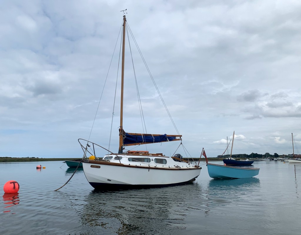 Snipe VII and her tender, ‘The Toad’, on her mooring in Brancaster Staithe in July 2020.
